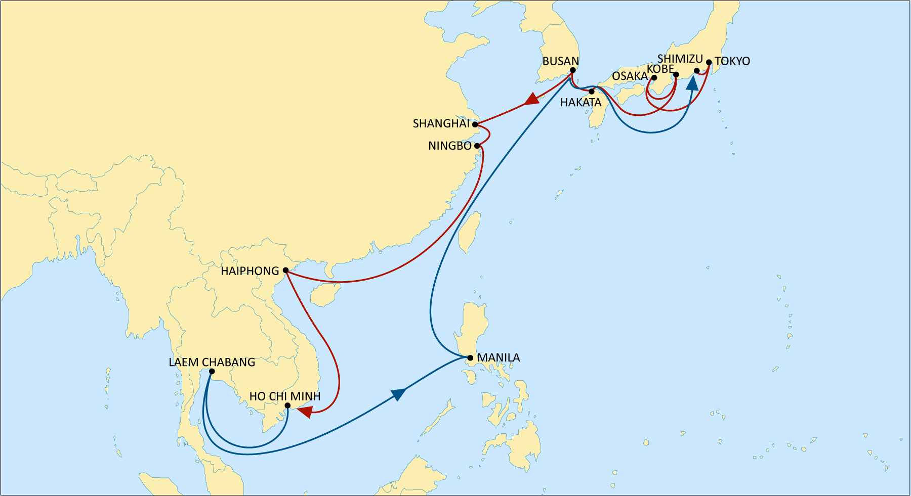 Shimizu – Tokyo – Osaka – Kobe – Hakata – Busan – Shanghai – Ningbo – Haiphong – Ho Chi Minh – Laem Chabang – Manila – Busan – Shimizu