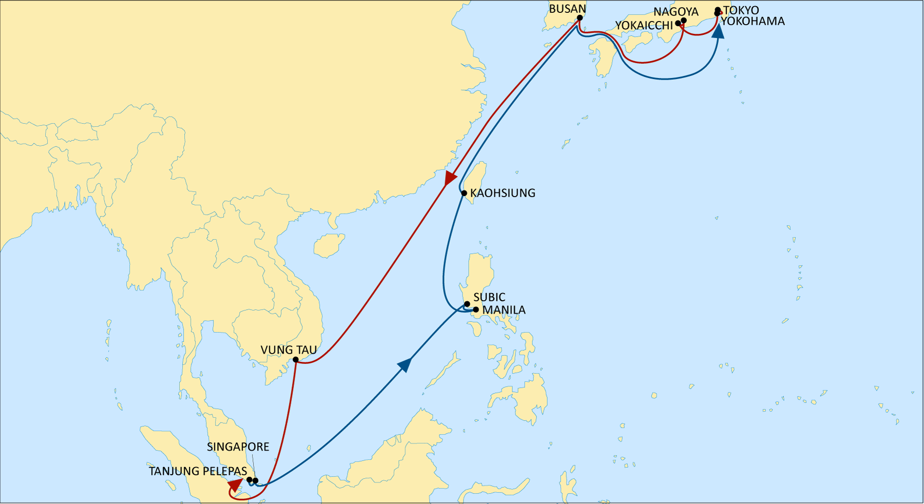 Tokyo – Yokohama – Yokkaichi – Nagoya – Busan – Vung Tau – Tanjung Pelepas – Singapore – Subic – Manila – Kaohsiung – Busan – Tokyo
