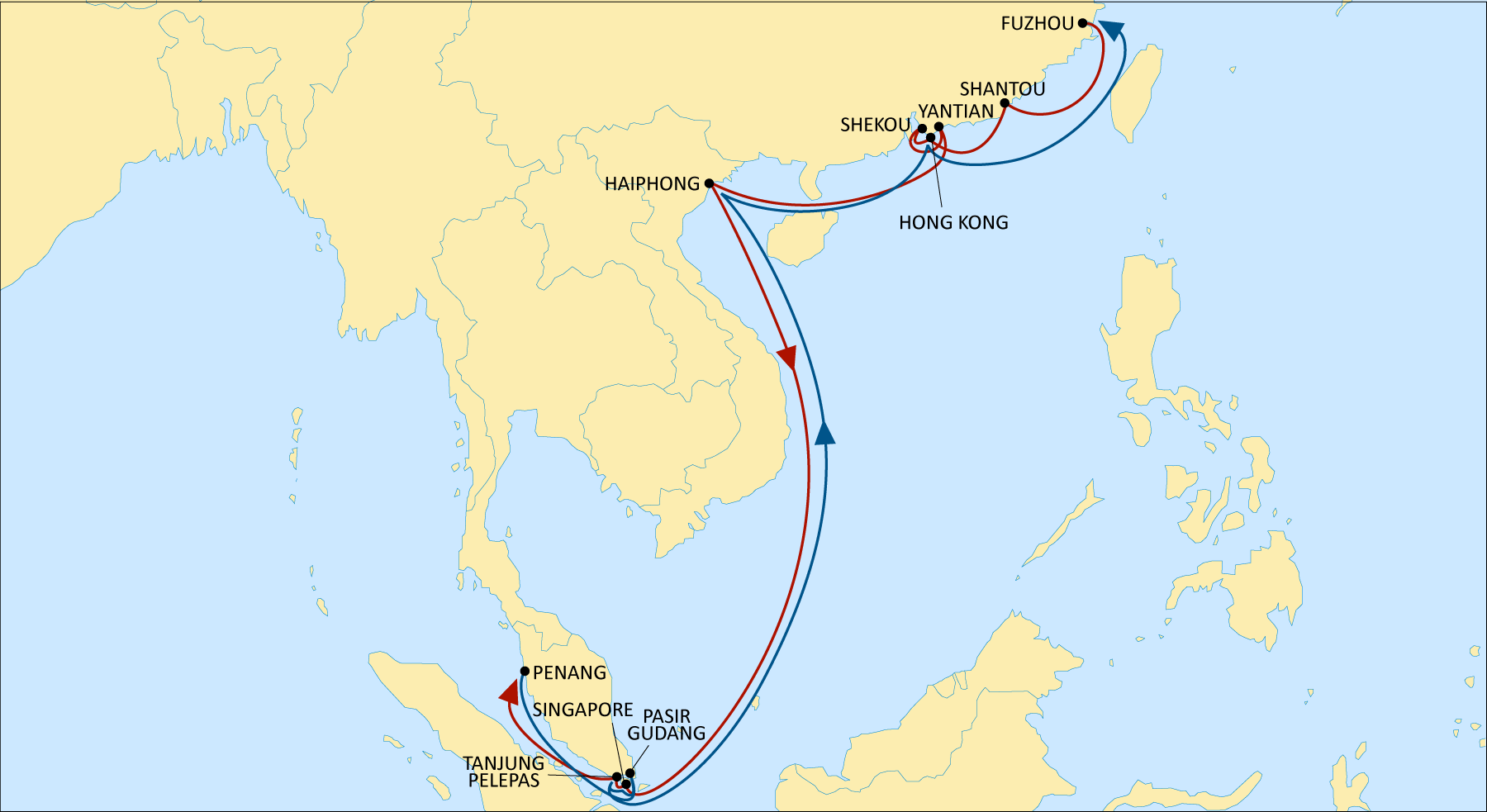Shanghai – Ningbo – Xiamen – Singapore – Tanjung Pelepas – Jakarta – Port Klang – Singapore – Tanjung Pelepas – Laem Chabang – Vung Tau – Shekou – Shanghai