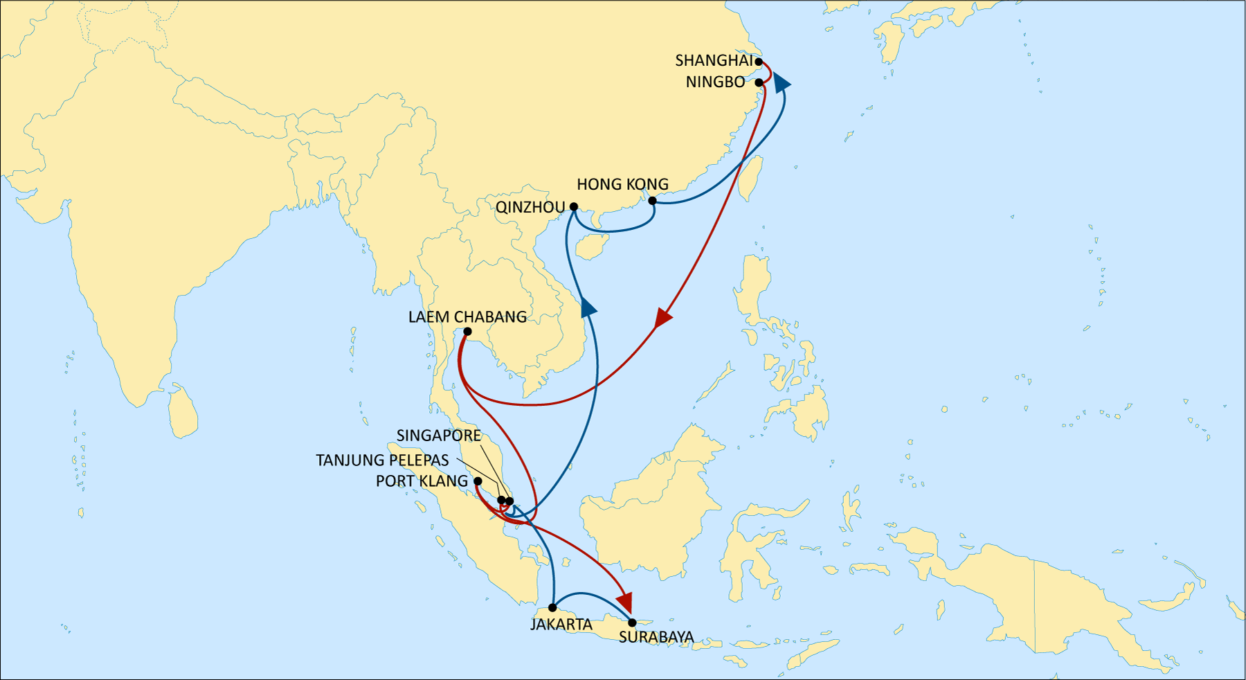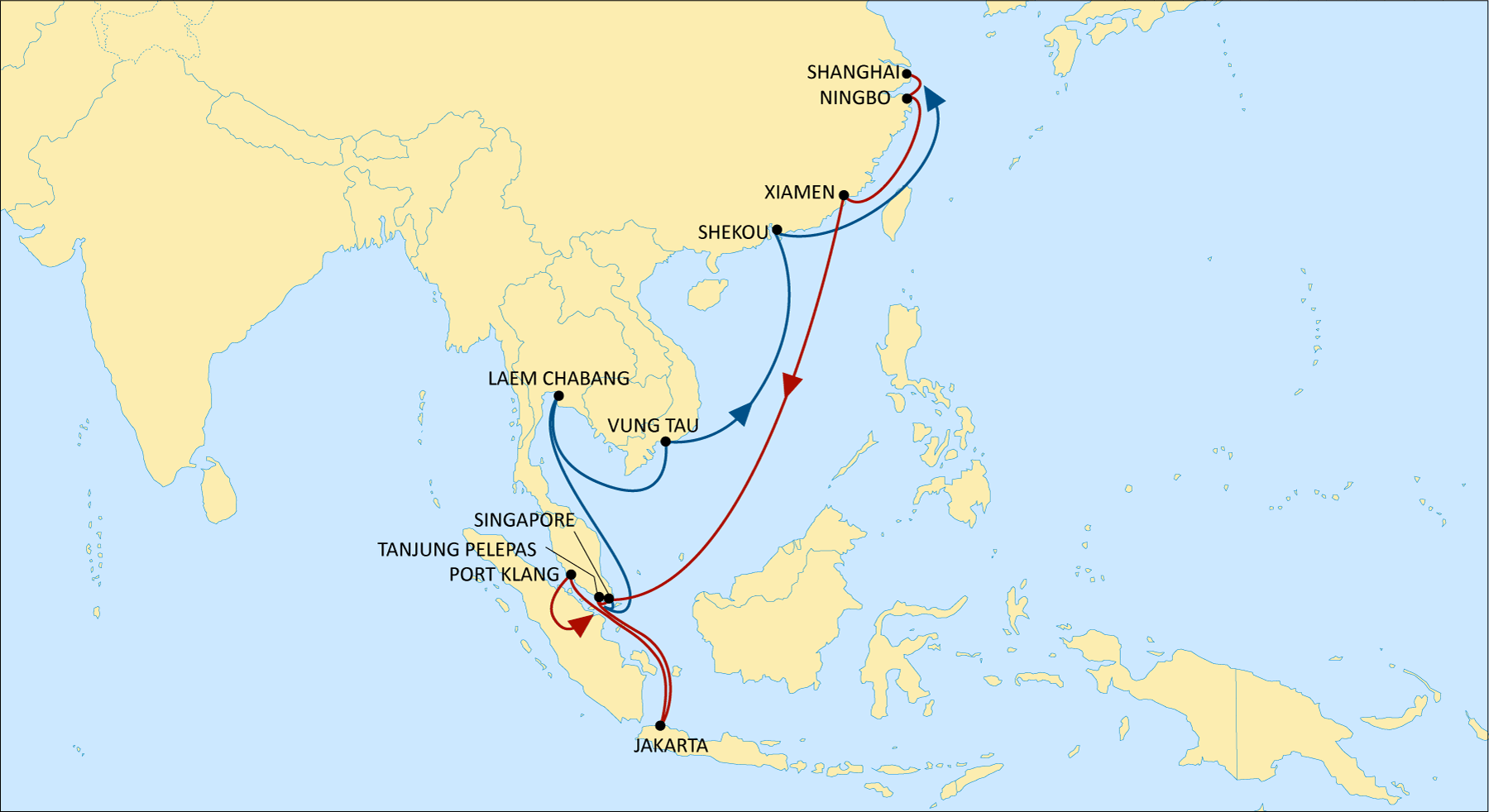 Shanghai – Ningbo – Laem Chabang – Port Klang – Singapore – Tanjung Pelepas – Surabaya – Jakarta – Singapore – Tanjung Pelepas – Qinzhou – Hong Kong – Shanghai