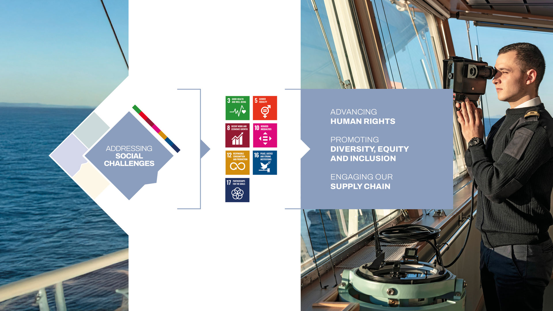 Wir leben in einer vernetzten Welt, in der das Geschäft globaler Unternehmen Menschen und Gesellschaften verbindet und Wohlstand bringt. Die Förderung der Menschenrechte und die Gewährleistung eines gerechten Übergangs zu einer CO2-reien Wirtschaft stehen im Mittelpunkt der Geschäftsvon MSC Unser sozialer Einfluss geht über unsere vielfältige Belegschaft hinaus und schließt auchunsere Geschäftspartner mit ein, mit denen wir am Aufbau eines nachhaltigen Liefernetzwerks arbeiten.
