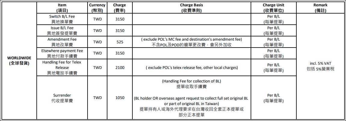 MSC Taiwan Local Charges – Export (Subject to 5% vat)